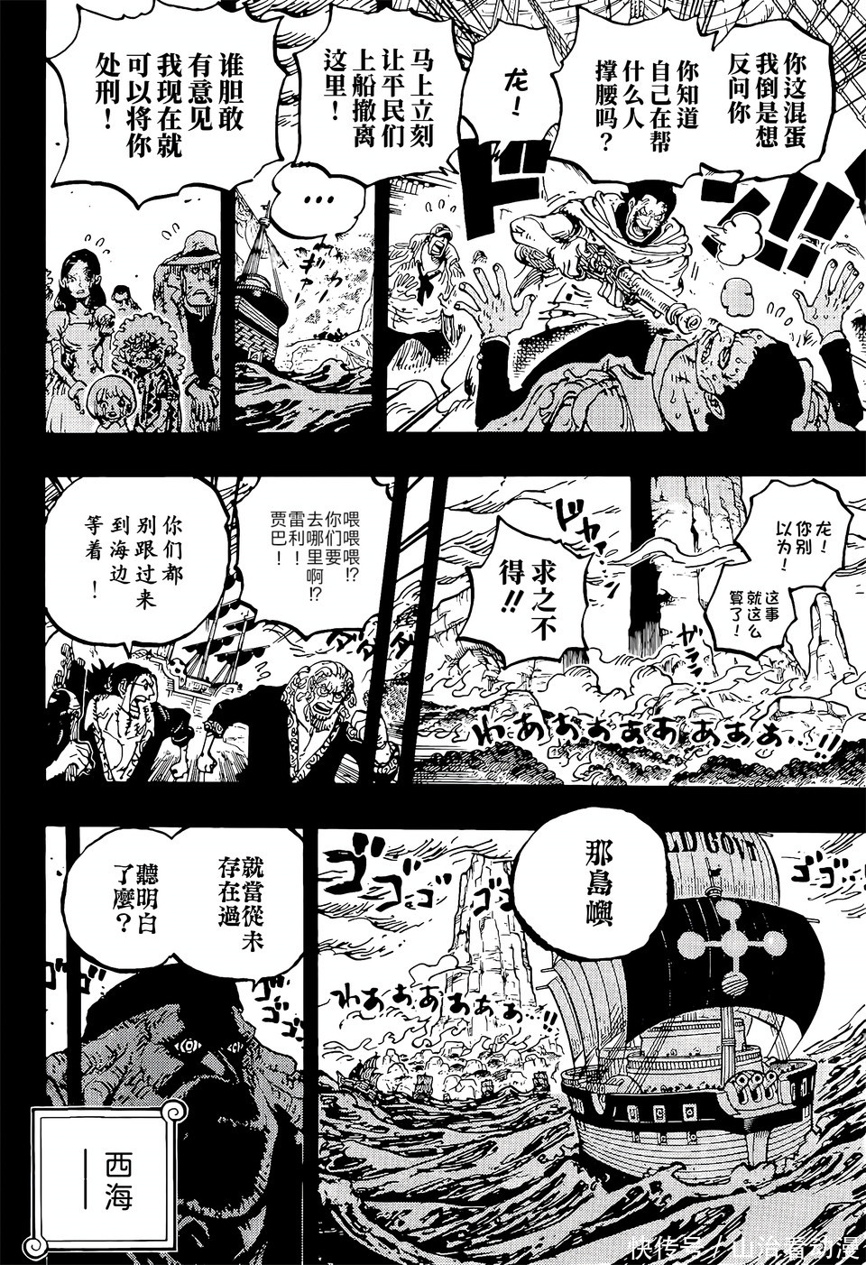神之谷大战还没有结束,洛克斯海贼团和罗杰海贼团还在神之谷,他们即将离开神之谷。海贼已经抢走了天龙人的财宝,洛克斯海贼团也解散了,白胡子,金狮子,凯多,大妈,银斧,约翰船长等人纷纷离开洛克斯海贼团。
